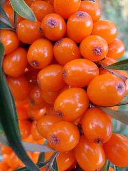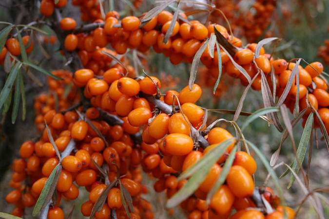 Плоды крупные, массой 0.72–0.8 г., удлиненно-округлой формы, желто-оранжевые, блестящие. Кожица тонкая, но очень плотная. Отрыв ягод сухой или полусухой. Транспортабельность хорошая. Мякоть сочная, кислая, с приятным ароматом. Дегустационная оценка свежих плодов 4.5 балла. Содержание витамина С в ягодах варьирует от 49.3 до 167.4 мг%, в среднем составляет 72.2–75.1 мг%.