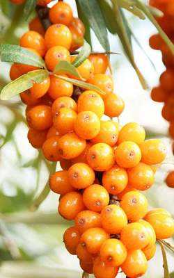 Облепиха Огниво. Представляет собой сильнорослый древовидный куст с округлой формой кроны средней густоты. Облиственность кроны средняя. Плоды крупные (0,8-1,0 г), цилиндрические, оранжево-красной окраски, сладко-кислого вкуса. Характер отрыва плодов – сухой. Срок созревания плодов – средний.