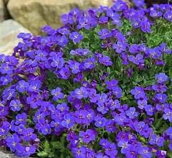 Обриета Cascade Blue (Каскейд Блу). Цветки голубовато-фиолетовые, при определенном освещении кажутся ярко-синими. Многолетнее неприхотливое растение, устойчивое к болезням, вечнозеленое. Листья мелкие, серо-зелёные. Благодаря раннему цветению обриета является особенно ценным медоносным растением.