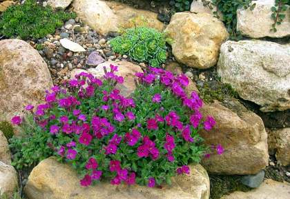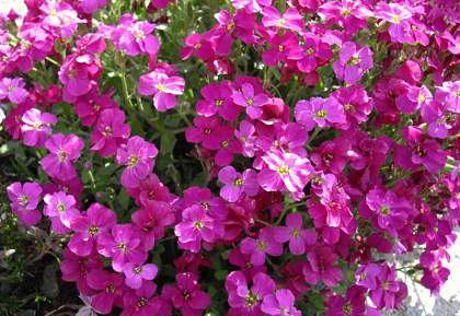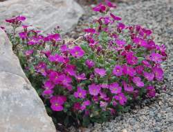 Обриета Cascade Red (Каскад Рэд). Многолетнее травянистое растение до 15 см высотой. Листья дельтовидные с одним-двумя зубцами на каждой стороне, серо-зеленые. Цветки лиловые до 1 см в диаметре, собраны в рыхлое кистевидное соцветие. Цветет с мая 30-35 дней.