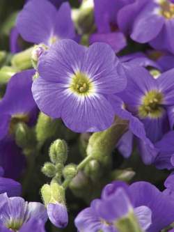 Обриета Florado Blue Eye (Флорадо Блю Ай). Подушковидные кусты вырастают до 15 сантиметров в высоту. Окраска цветка фиолетовая с белым центром. Цветет с мая по июнь.
