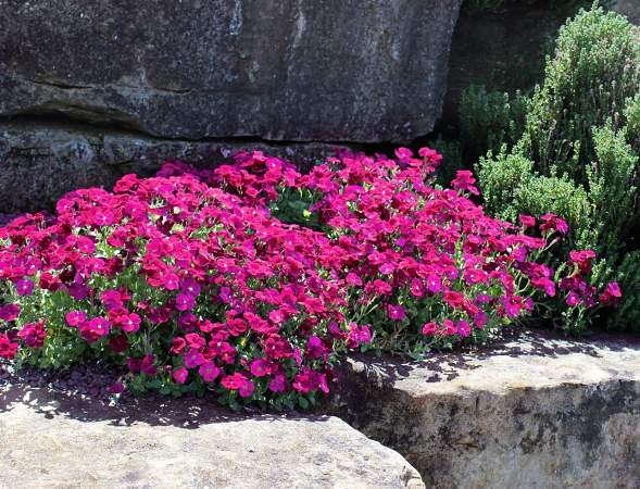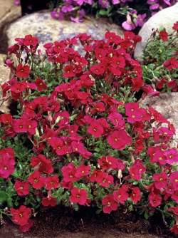 Обриета Florado Red (Флорадо Ред). Стебли распростертые, формируют кочки. Цветки 1,5 см. Растение очень декоративно в пору цветения, когда листья почти не видны из-за массы цветков.