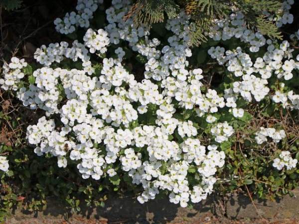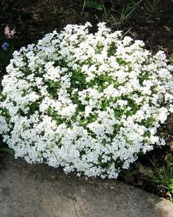 Обриета Florado White (Флорадо Вайт). Подушковидные кусты вырастают до 15 сантиметров в высоту. Окраска цветка белая. Цветет с мая по июнь.