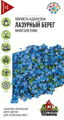 Обриета Лазурный берег. Крупноцветковая обриета -многолетнее растение, образующее распростертые куртинки до 8-10 см высотой, зимующие под снегом. Цветки до 1,5 см, сине-фиолетовые. Цветет в мае -июне, осенью наблюдается повторное цветение. Месторасположение только солнечное, даже в полутени обриета вытягивается и практически не цветет. Обриета предпочитает легкие, не слишком плодородные, некислые почвы. После майского цветения растения сразу обрезают, что способствует быстрому и более компактному росту. Отлично подойдет для создания альпинария.