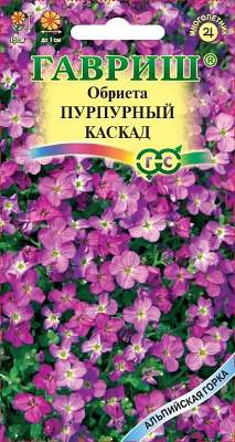 Обриета Пурпурный каскад. Многолетнее растение, образующее красивые распростертые куртинки до 15 см высотой, зимующие под снегом. Листья мелкие, продолговато-лопатчатые, с зазубренными краями. Цветки до 1 см в диаметре, пурпурные. Все растение очень декоративно в пору цветения, когда листья почти не видны из-за массы цветков. Цветет с мая около 35-45 дней. Месторасположение только солнечное, даже в полутени обриета вытягивается и практически не цветет. Обриета предпочитает легкие, не слишком плодородные почвы с добавлением извести или мела, совершенно не выносит закисающих тяжелых переувлажненных глин, а также жирной земли, содержащей торф. Особенно губительна влага в зимний период, поэтому сажают растения на каменистых горках, на приподнятых или хорошо дренованных участках. После майского цветения растения сразу обрезают, что способствует новому быстрому и более компактному росту. Осенью наблюдается повторное цветение. Посев производят в конце апреля — мае или в ноябре.