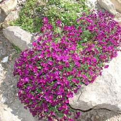Обриета Regado Red (Регадо Рэд). Многолетнее травянистое растение до 15 см высотой. Листья дельтовидные с одним-двумя зубцами на каждой стороне, серо-зеленые. Цветки лиловые до 1 см в диаметре, собраны в рыхлое кистевидное соцветие. Цветет с мая 30-35 дней.