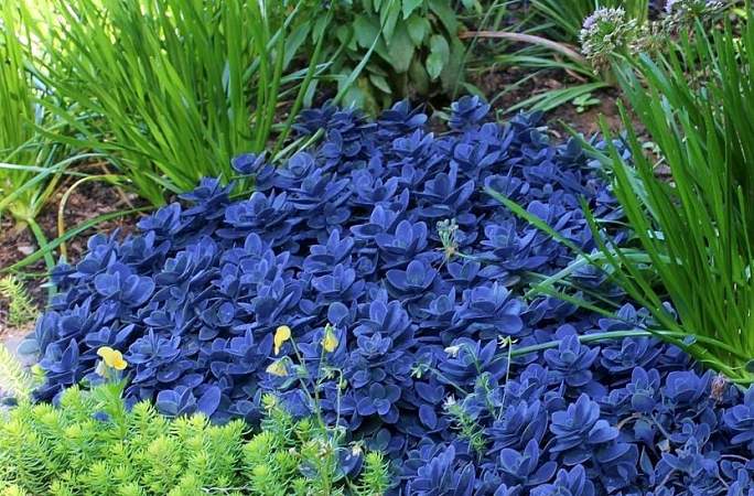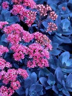 Очиток Blue Pearl (Блю Перл). Шикарный, яркий, элегантный почвопокровный очиток. Высота взрослого растения достигает 15-20 см при ширине 35-45 см, образует плотный ковёр из интенсивно-дымчато-синей листвы с фиолетово-бордовым оттенком и больших ярко-розовых соцветий. Очень эффектно оттенит любую композицию. Необычность этого очитка — в очень крупных, практических круглых листьях, которые образуют розетку, похожую на цветок розы.