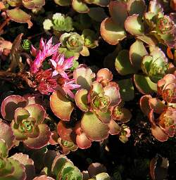Многолетник с ползучим, длинным корневищем. Стебли стелющиеся или приподнимающиеся, цветоносные стебли длиной 6-20 (25) см, тонко-пушистые. Листья мясистые, красные, 1-2,5 х 0,5-1 см. Соцветие щитковидное, густое. Цветки темно-розовые. Широко распространен в культуре. Быстро разрастающееся зимостойкое почвопокровное растение. Больше всего для него подходят дренированные, плодородные, нормально увлажненные почвы и солнечное место. Слишком мощный очиток для малых горок, способен подавлять более деликатные виды. Зато прекрасно смотрится в цветниках миксбордерах, на ковровых клумбах. Незаменим для закрепления склонов. Самый распространенный в садах очиток.