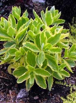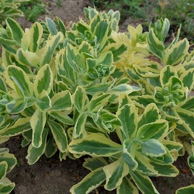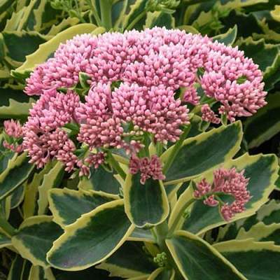 Очиток Elsie's Gold (Элсис Голд). Листья сочные, весной и летом зелёные с золотисто-жёлтой каймой, осенью кайма становится кремовой. Бутоны розовые. Цветки насыщенного тёмно-розового цвета, звёздчатые, в больших плоских соцветиях. Цветение в августе-октябре. Высота и ширина 60 см.
