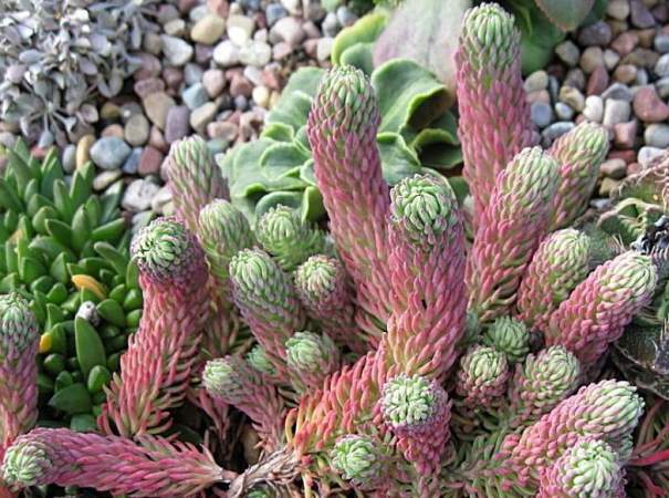Очиток Форстера Oracle (Оракл). Цветет в июне-июле мелкими желтыми звездчатыми цветками, собранными на верхушках голых прямостоящих цветоносов в щитковидные соцветия размером 5-6 см. Листья тонкие, острые, длиной 6-10 мм, гладкие, мясистые. Наиболее декоративен на просторных участках с ярким рассеянным освещением, может расти в полутени. Предпочитает плодородные дренированные почвы.