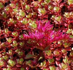 Многолетник с ползучим, длинным корневищем. Стебли стелющиеся или приподнимающиеся, цветоносные стебли длиной 6-20 (25) см, тонко-пушистые. Листья мясистые, красные, 1-2,5 х 0,5-1 см. Соцветие щитковидное, густое. Цветки пурпурные. Широко распространен в культуре. Быстро разрастающееся зимостойкое почвопокровное растение. Больше всего для него подходят дренированные, плодородные, нормально увлажненные почвы и солнечное место. Слишком мощный очиток для малых горок, способен подавлять более деликатные виды. Зато прекрасно смотрится в цветниках миксбордерах, на ковровых клумбах. Незаменим для закрепления склонов. Самый распространенный в садах очиток.