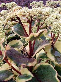Очиток Ice Ruffles (Айс Раффлс). Листья плотные, мясистые, темно-зеленые с кремовой каймой и красным кантом. Осенью листья становятся бронзово-красными. Щитковидное крупное соцветие из мелких кремовых цветков. Стебли красные. Цветение довольно обильное с июля до сентября. Очиток Ice Ruffles высокодекоративен весь сезон.