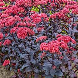 Очиток Jose Aubergine (Хосе Обеджин). Очень красивый сорт. Высота в цвету около 50 см. Листья темно-пурпурные, чернильные. Цветки красновато-розовые, собранные в щитки. Цветет в июле-августе.