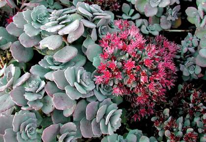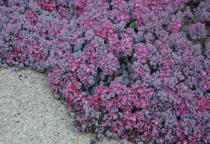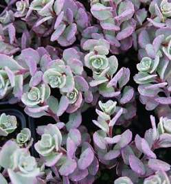 Очиток наутесный Lidakense (Лидакенсе). Листья серовато-фиолетовые. Стебли тонкие, лежачие, в высоту могут быть до 5-8 см, длина свисающих стеблей 20-25 см. Цветки, появляющиеся в сентябре, мелкие, собраны в густые пышные соцветия, сначала имеют пурпурный оттенок, позже становятся розовато-фиолетовыми.