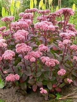 Очиток Matrona (Матрона). кустик до 60 сантиметров, цветы мелкие, бело-розовые, собраны в соцветия-щитки от 10 до 20 сантиметров в диаметре, листья плотные, блестящие с легким пурпурным оттенком, собраны в мутовки.