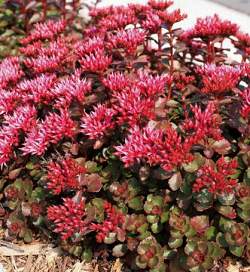Многолетник с ползучим, длинным корневищем. Стебли стелющиеся или приподнимающиеся, цветоносные стебли длиной 6-20 (25) см, тонко-пушистые. Листья мясистые, зелено-пурпурные, 1-2,5 х 0,5-1 см. Соцветие щитковидное, густое. Цветки пурпурные. Широко распространен в культуре. Быстро разрастающееся зимостойкое почвопокровное растение. Больше всего для него подходят дренированные, плодородные, нормально увлажненные почвы и солнечное место. Слишком мощный очиток для малых горок, способен подавлять более деликатные виды. Зато прекрасно смотрится в цветниках миксбордерах, на ковровых клумбах. Незаменим для закрепления склонов. Самый распространенный в садах очиток.