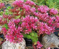 Многолетник с ползучим, длинным корневищем. Стебли стелющиеся или приподнимающиеся, цветоносные стебли длиной 6-20 (25) см, тонко-пушистые. Листья мясистые, темно-зеленые, 1-2,5 х 0,5-1 см. Соцветие щитковидное, густое. Цветки розовые или пурпурные. Широко распространен в культуре. Быстро разрастающееся зимостойкое почвопокровное растение. Больше всего для него подходят дренированные, плодородные, нормально увлажненные почвы и солнечное место. Слишком мощный очиток для малых горок, способен подавлять более деликатные виды. Зато прекрасно смотрится в цветниках миксбордерах, на ковровых клумбах. Незаменим для закрепления склонов. Самый распространенный в садах очиток.