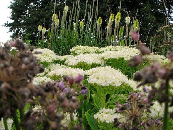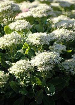 Очиток Stardust (Стардаст). Многолетнее растение до 50 см высотой с утолщенными корнями и прямостоячими стеблями. Листья сидячие, крупные, овальные голубовато-зеленые по 3-4 в мутовках, голые, по краю зубчатые.