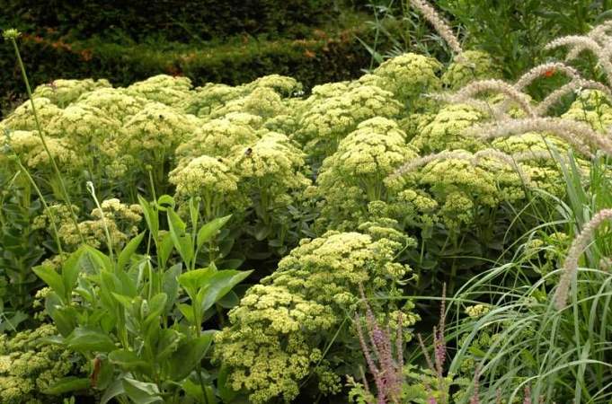 Седум Sunkissed (Санкист). Невысокий компактный сорт. Высота всего 30 см. Цветки мелкие звездчатые, желтые, собранные в щитковидные соцветия. Сорт декоративен в течение всего периода вегетации.