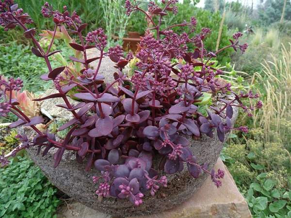 Очиток SunSparkler Cherry Tart (Черри Тарт). Цветки тёмно-розовые, в больших соцветиях диаметром 12 см. Листья маленькие, круглые, весной оливково-зелёные, летом и осенью тёмно-вишнёво-красные. Стебли кирпично-красные. Место солнечное. Почва песчаная, хорошо дренированная. Полностью зимостоек в средней полосе России.
