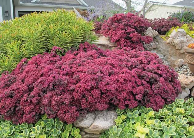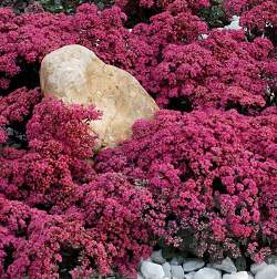 Седум SunSparkler Dazzleberry (Санспарклер Дазлберри). Почвопокровное растение, высотой не более 15-20 см. Цветки очень яркие, малиновые, собраны в крупные соцветия, диаметром до 20 см.