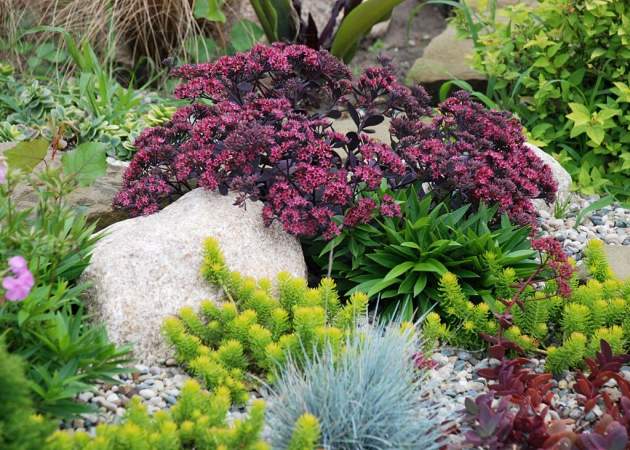 Очиток SunSparkler Plum Dazzled (Плам Дазлд). Компактный, очень плотный, хорошо разветвлённый седум высотой 25 см и шириной 40 см. Листья зелено-фиолетовые. Цветки вишнёвые. Цветение в августе-сентябре. Место солнечное. Почва песчаная, хорошо дренированная. Полностью зимостоек в средней полосе России.