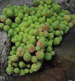 Обладает ползучими сизо-зелеными густо облиственными побегами и мелкими соцветиями белых цветков. У него много бесплодных побегов и относительно мало цветущих. Соцветия короткие, а лепестки розоватые. Цветет в середине лета. При выращивании на солнечных местах приобретает красивый розоватый оттенок. Выносит полутень.
