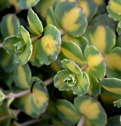 Голые, ползучие стебли красноватого цвета образуют густые низкие ковровые заросли. Листья сидячие, округлые, зубчатые, сизо-голубоватые, с кремовым или бледно-желтым пятном в середине, на солнце могут приобретать трехцветную окраску — край листа краснеет. Соцветия — верхушечные, зонтиковидно-щитковидные метелки, диаметром 2 — 4 см. Цветки розовые. Зимой листья и стебли вымерзают. Весной молодые побеги появляются вновь от корневища только при установлении устойчивого потепления. Предпочитает сухое солнечное место, выносит полутень.