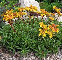 Очиток Weihenstephaner Gold (Вайнштефанер Голд). Красочный! Отличается изящными темно-зелеными листьями с редкими зубчиками по краю, и выразительными крупными щитковидными соцветиями из желтых пятилепестковых цветков!