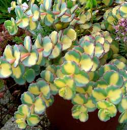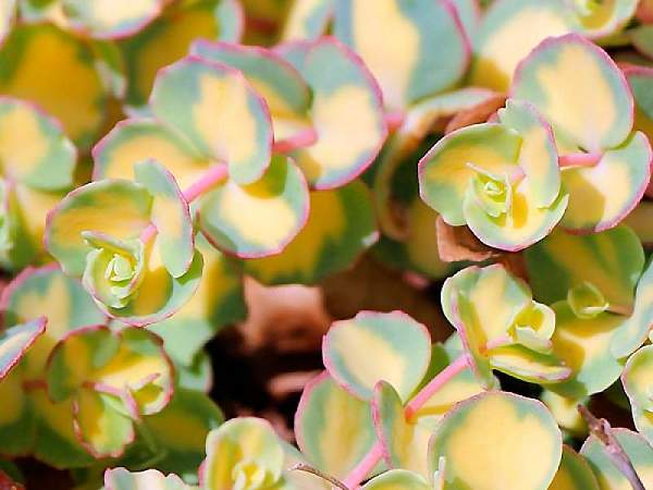 Очиток Зибольда Mediovariegatum (Медиовариегатум). Многолетник с необычной окраской листьев — крупные кремово-белые пятна в центре и сиреневая кайма по краю. Побеги ниспадающие, длинной до 20 см. Цветки розовые. Цветет летом. Неприхотлив, но боится замокания.