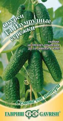 Огурец Изумрудные сережки F1 10 шт. корнишон авторский. Скороспелый (42-47 дней от всходов до плодоношения) партенокарпический гибрид с букетным расположением завязей (8-10 в узле!) для выращивания в теплицах, под временными пленочными укрытиями и в открытом грунте. Растение сильнорослое, средневетвистое, женского типа цветения. Плоды цилиндрические, длиной 9-11 см, диаметром 3,0-4,0 см, массой 100-110 г, темно-зеленые, с частыми бугорками среднего размера, белошипые. Использование плодов универсальное.