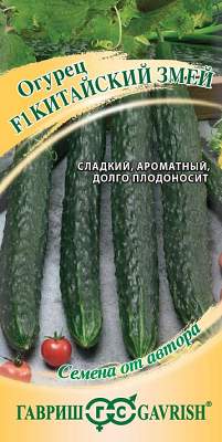Огурец Китайский змей. Китайские сорта огурцов славятся непревзойденным вкусом и ароматом плодов: сладкие, сочные, без пустот, с тонкой нежной кожицей и маленькими семенными камерами — идеальны для приготовления свежих летних салатов. Гибрид среднепоздний, пчелоопыляемый. Растение мощное, интенсивно развивающееся, с продолжительным периодом плодоношения. Выращивают с использованием временных пленочных укрытий. Гибрид требователен к плодородию почвы, рекомендуются регулярные подкормки. Зеленец длинный, до 60 см, темно-зеленый, крупно- и редкобугорчатый, с ручкой. Посев на рассаду — в конце апреля. Высадка рассады в грунт — в конце мая-начале июня в фазе 3-4-х настоящих листьев. Посев непосредственно в грунт — в мае-июне. Схема посадки: 50x100 см. Для повышения продуктивности главный побег прищипывают после 6-7 листа. Урожайность при правильной агротехнике достигает 30 кг/м2. Семена после уборки сохраняют всхожесть в течение 7 лет при оптимальных условиях хранения. Рекомендуется увеличить норму высева по истечении срока годности.