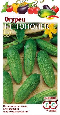 Огурец Тополек F1. Среднеспелый (50-58 дней от полных всходов до плодоношения) пчелоопыляемый, засолочный гибрид. Предназначен для выращивания в открытом грунте и под временными пленочными укрытиями. Посев на рассаду в начале мая. Высадка в грунт в конце мая — начале июня в фазе двух-трех настоящих листьев. Посев непосредственно в открытый грунт проводится в конце мая — начале июня. Схема посадки 40 х 40 см. Растение средневетвистое, главный побег длинный. Зеленец овально-цилиндрический, длиной 12-13 см, крупнобугорчатый, долго не желтеет. Масса 133-149 г. Вкусовые качества отличные. Устойчив к мучнистой и ложной мучнистой росе. Используется в свежем виде и для засолки. Урожайность 4-6 кг/м2.