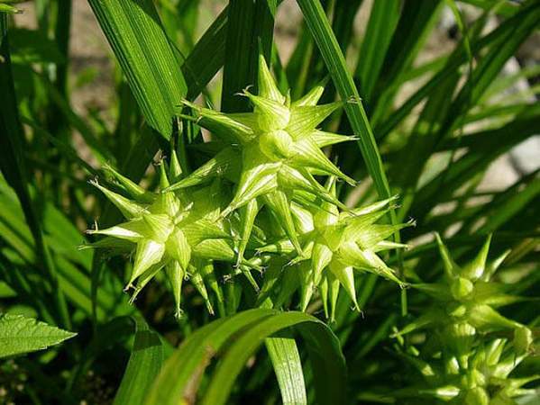 Осока Грея. Рано отрастающая осока. Светло-зеленые, почти салатные листья образуют холмообразную, медленно расползающуюся кочку, высотой около 50-60 см. В конце июня появляются цветоносные стебли, на конце которых образуются булавовидные семенные головки светло-зеленого цвета, диаметром 2-4 см, не теряющие привлекательности все лето и осень.