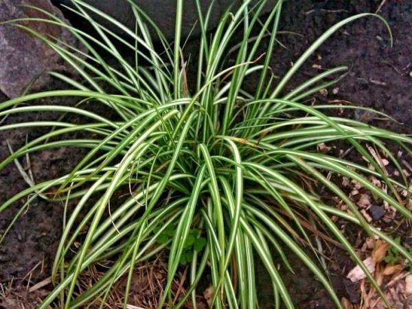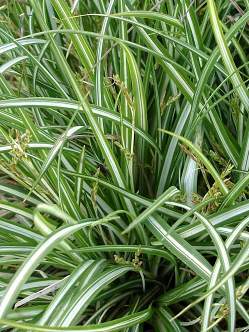 Осока Птиценожковая. Вечнозеленый низкорослый злак, растущий до 30 см. Изогнутые листья с ярко выделяющейся широкой бело-кремовой полосой по середине. Оригинально смотрится с растениями темной окраски. Цветет необычными цилиндрическими коричневыми свисающими колосьями, похожими на птичьи лапки.
