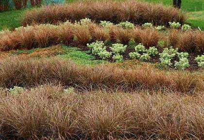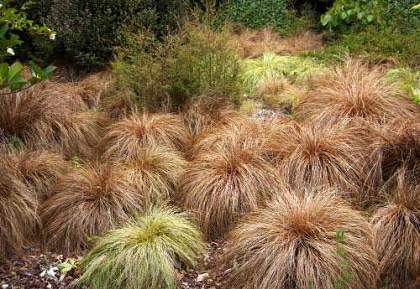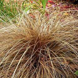 Осока власовидная Bronzita (Бронзита). Рассада дает пышный шарообразный куст, сформированный длинными узкими листьями. В любое время года имеет бронзовый оттенок,