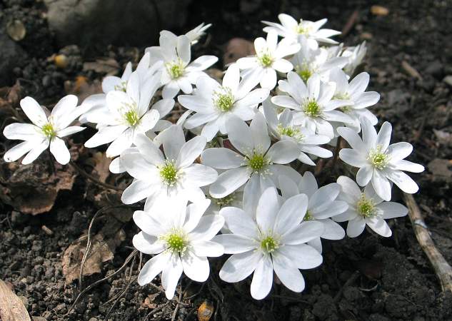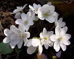 Печеночница азиатская. Тенелюбивое растение. Образует куртины высотой 5-10 см. Листья трехлопастные, вначале вегетации розовато-коричневые, затем становятся темно-зелеными. Цветки до 2 см в диаметре, белые. Цветет в апреле.