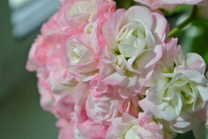 Пеларгония махровая розебудная April Snow (Эприл Сноу). Зональная, карлик. Немного похожа на цвет Apple Blossom, но меньше по размерам. Цветки светлее — белые с зеленой серединкой и нежно-розовыми краями лепестков. Цветет с весны до осени обильно. Растет вширь, что очень привлекательно.