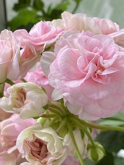 Пеларгония махровая ЮВ_Рапунцель. Зональная, ближе к компакту. Цветки крупные, светло-розовато-лиловые, нижние лепестки зеленоватые, подкладка белая. Сорт заметный, воздушный, очень привлекательный. Соцветия кажутся перламутровыми. Зацветает легко, соцветия шаровидные. Цветоносы средней длины. Хорошо кустится самостоятельно.