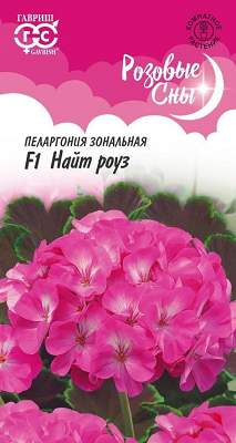Пеларгония Найт Роуз F1 зональная. Популярное многолетнее комнатное растение из семейства Гераниевые. В пору обильного цветения герань придает окнам праздничный вид. Формирует объемный и компактный кустик высотой 35 см, диаметром 25 см. Этот сорт уникален благодаря декоративным коричневым листьям с тонкой зеленой каймой по краю. Особенно эффектно коричневолистные сорта выглядят в белой цветочной таре. Цветки фиолетово-розового цвета, образуют крупные, шаровидные соцветия. При тщательном уходе может цвести весь год. Пеларгония светолюбива, неприхотлива в культуре, легко переносит недостаток влаги. Размещают растение на солнечных восточных и западных окнах. В теплое время года любит обильный, частый полив. Зимой, в зависимости от температуры, поливают умереннее. Подкармливают растение минеральными удобрениями, обогащенными калием. Для получения цветущих растений к началу лета посевы производят с декабря по февраль, используя в качестве субстрата чистый торф или смесь торфа с песком. Для комнатного использования высевают в марте-апреле. Всходы обычно появляются через 2-3 недели после посева. В фазе двух-трех настоящих листочков растения пикируют в горшки. Для лучшего кущения рассаду прищипывают над пятым — шестым листом. Летом пеларгонию желательно выносить на свежий воздух, а зимой устанавливать в прохладной светлой комнате с температурой 10-12 °C. Геранями озеленяют балконы, веранды, лоджии. Их используют в цветочных композициях в полутенистых участках сада.