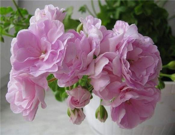 Пеларгония плющелистная Chiffon (Шифон). Одним из несомненных достоинств сорта является его компактность. Побеги с короткими междоузлиями позволяют создать "шапочку" в подвесной корзине. И тем более красиво на этом фоне смотрятся длинные цветоносы, несущие соцветия из розовых розочек. Цветет чрезвычайно обильно. Поддержать пеларгонию в период цветения просто необходимо. Комплексное удобрение вносят в период активной вегетации раз в три недели.