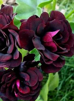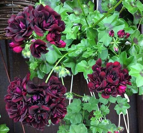 Пеларгония плющелистная Royal Black Rose (Роял Блэк Роуз). Ампельный сорт. Для получения компактного растения необходима прищипка или обрезка. Сорт восхитительный, способный очень обильно цвести. Цветки махровые, в полуроспуске — роскошные черно-фиолетовые розы. В полном роспуске тоже очень красивы.
