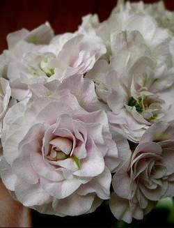 Пеларгония плющелистная розебудная Ice Rose (Айс Роуз). Ледяная роза. Цветки — белые розочки с легким сиреневым свечением. Цветет с весны до глубокой осени, обильно. Листья блестящие, ярко-зеленые. Куст формируется самостоятельно. Можно выращивать как в подвесном кашпо, так и просто на окне.