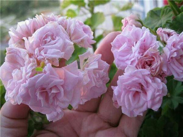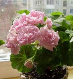 Пеларгония розебудная Achievement (Эчивмент). Иви-гибриды — результат скрещивания зональных и плющелистных пеларгоний. Очень красивые крупные густомахровые бледно-розовые цветы в форме розы. Куст стандартный по размеру, полуампельной формы, хорошо смотрится в подвесном кашпо. По мере роста для более пышного цветения растение формируют, прищипывая каждую веточку над 5-6 листом.