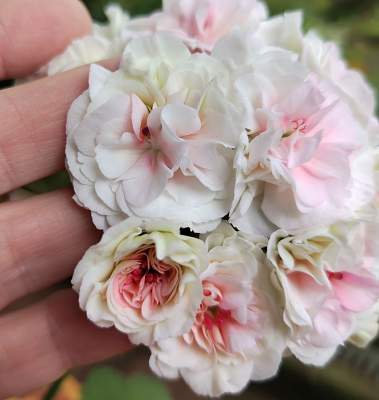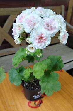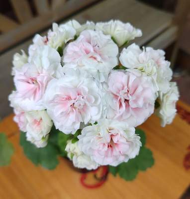 Пеларгония розебудная ИВ_Галина Уланова. Бело-розовый зефир. Зональная с зонартиковыми кровями. Кустик ровный, по размеру стандарт, с опушенными листьями среднего размера. Шапка бело-розовых цветков огромная (видно по фото). Форма восхитительная. Цветоносы высокие и прочные. Легко входит в цветение, бутоны раскрываются все, даже в холодную дождливую погоду.