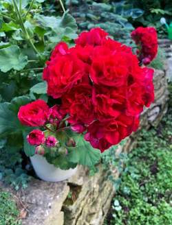 Пеларгония розебудная ИВ_Майя Плисецкая. Зональная с зонартиковыми кровями. Стандарт. Куст компактный, небольшой. Цветки очень крупные, махровые, бархатисто-красные. Соцветия крупные. Цветет с черенка, но на второй год становится просто бесподобной.