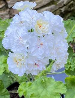 Пеларгония розебудная ИВ_Жемчужина Шах Сафи. Гибрид зональной и зонартика с преобладанием зонартиковых кровей. Цветки белые, розовидные, с яркими тычинками. Куст компактный, цветоносы короткие.