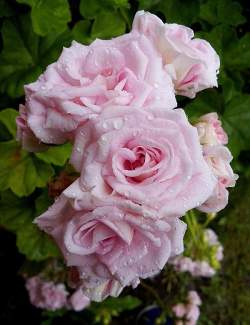 Пеларгония розебудная Rococo (Рококо). Относится к ИВИ-гибридам — гибридам, полученным скрещиванием зональной и плющелистной пеларгоний. Сорт выведен в США в 1981 году. Сорт очень красивый, цветки розовые, похожи на розы, куст требует прищипки, чтобы лучше ветвился.
