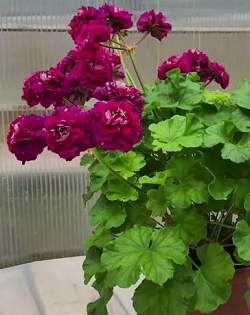 Пеларгония СиМ Дон-Жуан. Гибрид зональной и зонартика, карлик. Формирует очень компактный и аккуратный куст, листья без зоны, ярко-зеленые. Цветки — крупные фиолетовые розы. Зацветает легко и цветет практически без перерывов. Супер-сорт, новинка.