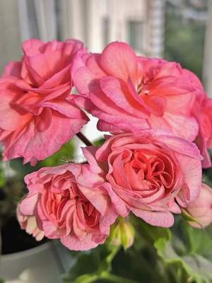 Пеларгония ТА_Горная Карусель. Зонартиковый гибрид, компактный. Листья крупные, слегка волнистые, ярко-зеленые. Цветки махровые, переливаются от бежевого до розового. Крупные, очаровательные, неповторимые. Зимой нужна подсветка и содержание в прохладном месте.